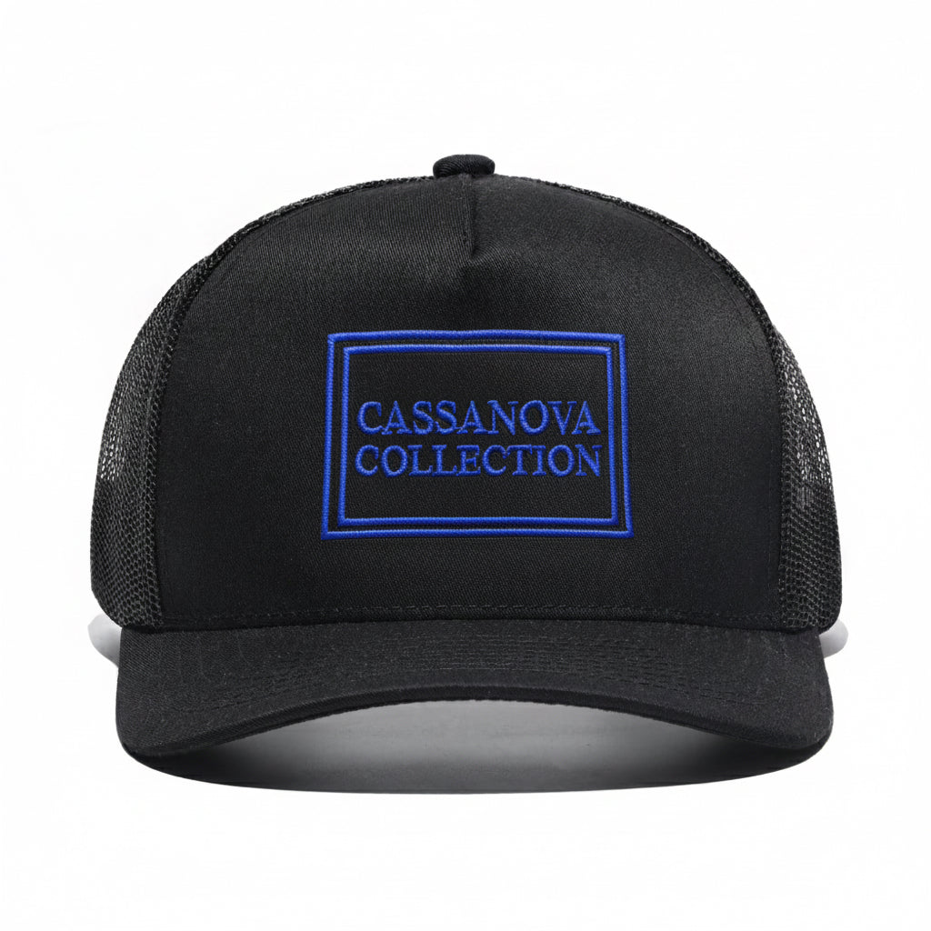 A clean, bold essential. This black SnapBack hat features a structured front panel with an embroidered royal-blue or white Cassanova box logo and breathable mesh backing. Lightweight, adjustable, and made to elevate any fit!